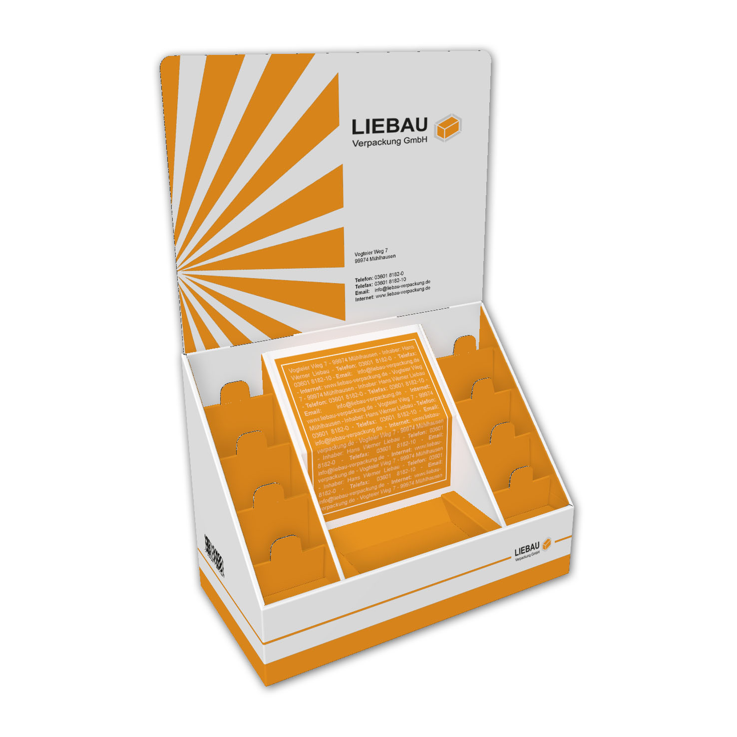 <<< >>> Beschreibung:Thekendisplay geklebtmit verschiedenen EinsätzenTopschild gestecktMaterial:off. E-Welle + 250g GD2Referenznummer:VE140107A03